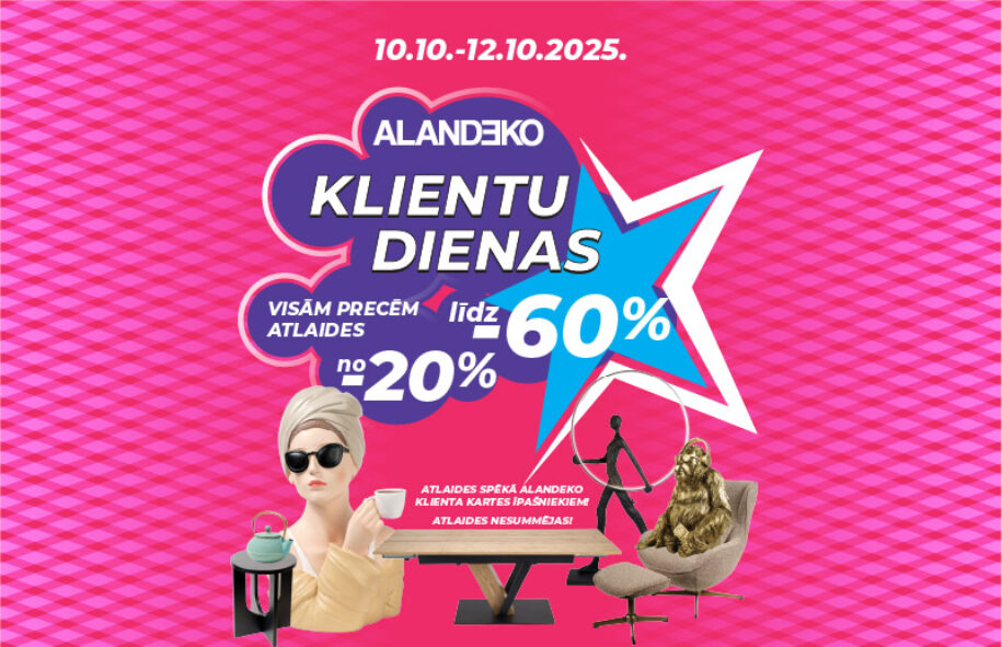Tikai 3 dienas oktobrī norisinās tradicionālās ALANDEKO klientu dienas, kas pilnīgi visām precēm veikalā tiek piemērotas atlaides no 20% līdz 60%, uzrādot ALANDEKO Klienta karti.