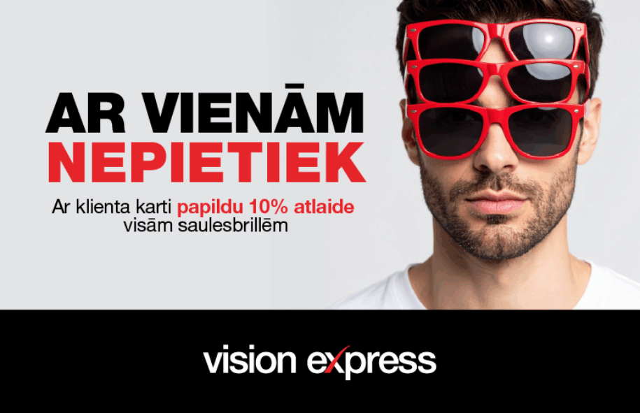 10% papildu atlaide saulesbrillēm ir spēkā ar Vision Express klienta karti un attiecas uz visām saulesbrillēm, kurām ir norādīta izpārdošanas atlaide.