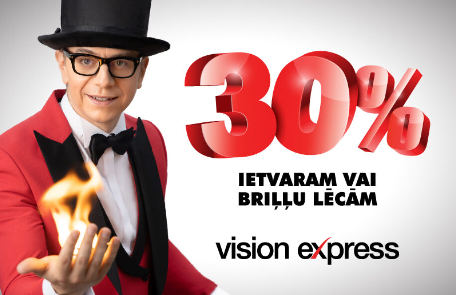 Atlaide spēkā, pērkot brilles (ietvars, 2 briļļu lēcas, briļļu izgatavošana). Izvelkot ripiņu no cilindra, saņem savu -30% atlaidi – briļļu lēcām vai ietvaram. Vision Express patur tiesības mainīt kampaņas noteikumus. Akcijas un atlaides nesummējas.