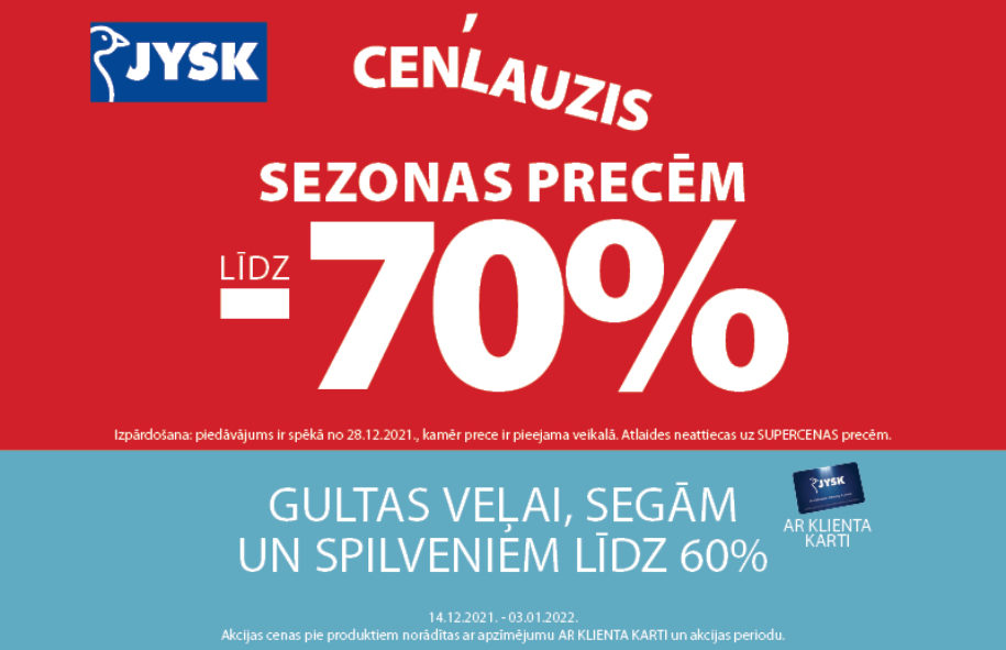 Ar JYSK klienta gultas veļai, segām un spilveniem līdz 60%, bet sezonas precēm līdz 70%