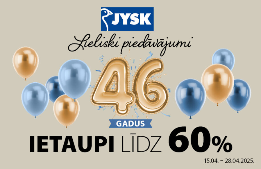 JYSK svin dzimšanas dienu ar atlaidēm līdz 60%, iekštelpu un dārza mēbelēm, segām, spilveniem, groziem, aizkariem un matračiem.
