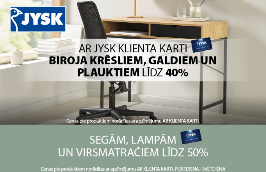 AR JYSK KLIENTA KARTI BIROJA KRĒSLIEM, GALDIEM UN PLAUKTIEM LĪDZ 40%, BET SEGĀM, LAMPĀM UN VIRSMATRAČIEM LĪDZ 50%