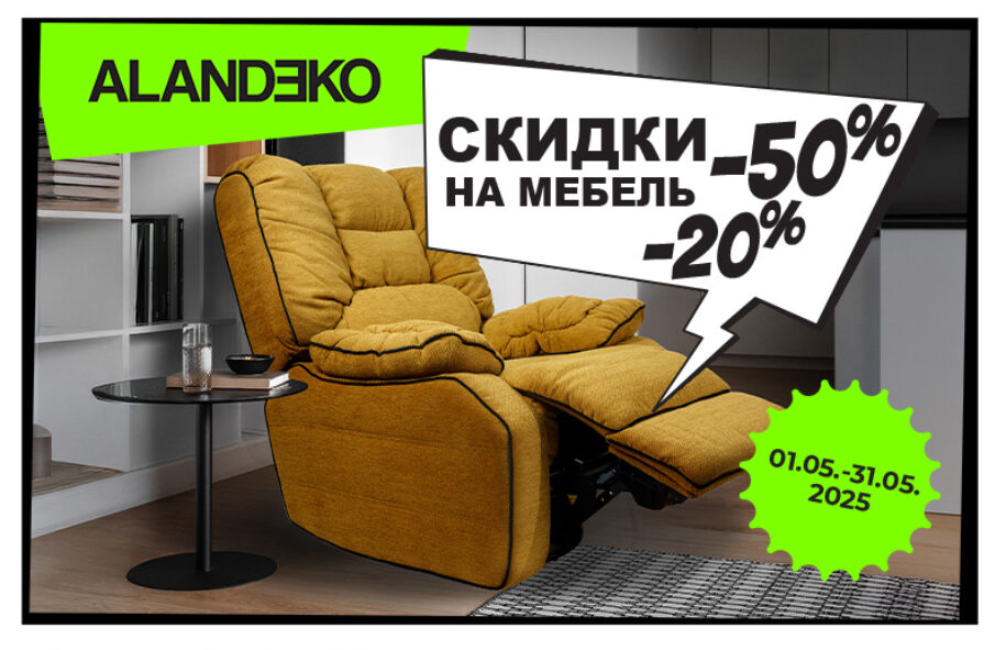 Только в мае скидки на всю мебель от -20% до -50%! 1.05.-31.05.2025.